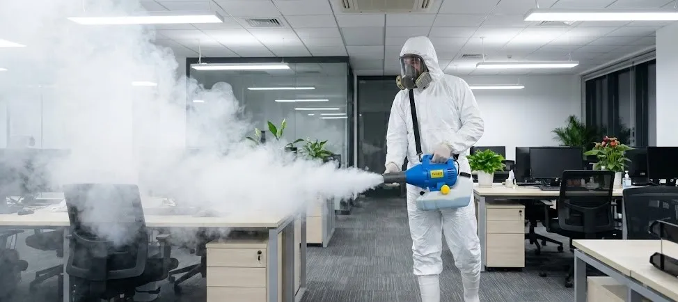 Micro-Nebulización en Frío: Utilizamos máquinas ULV (Ultra Bajo Volumen) que generan una niebla de partículas microscópicas.